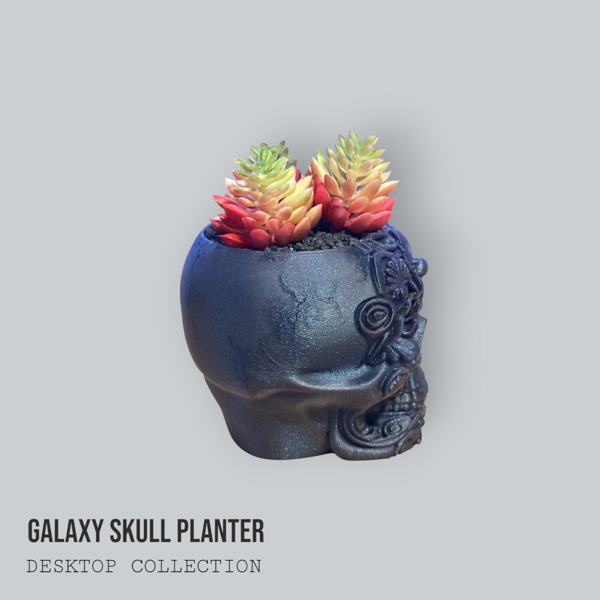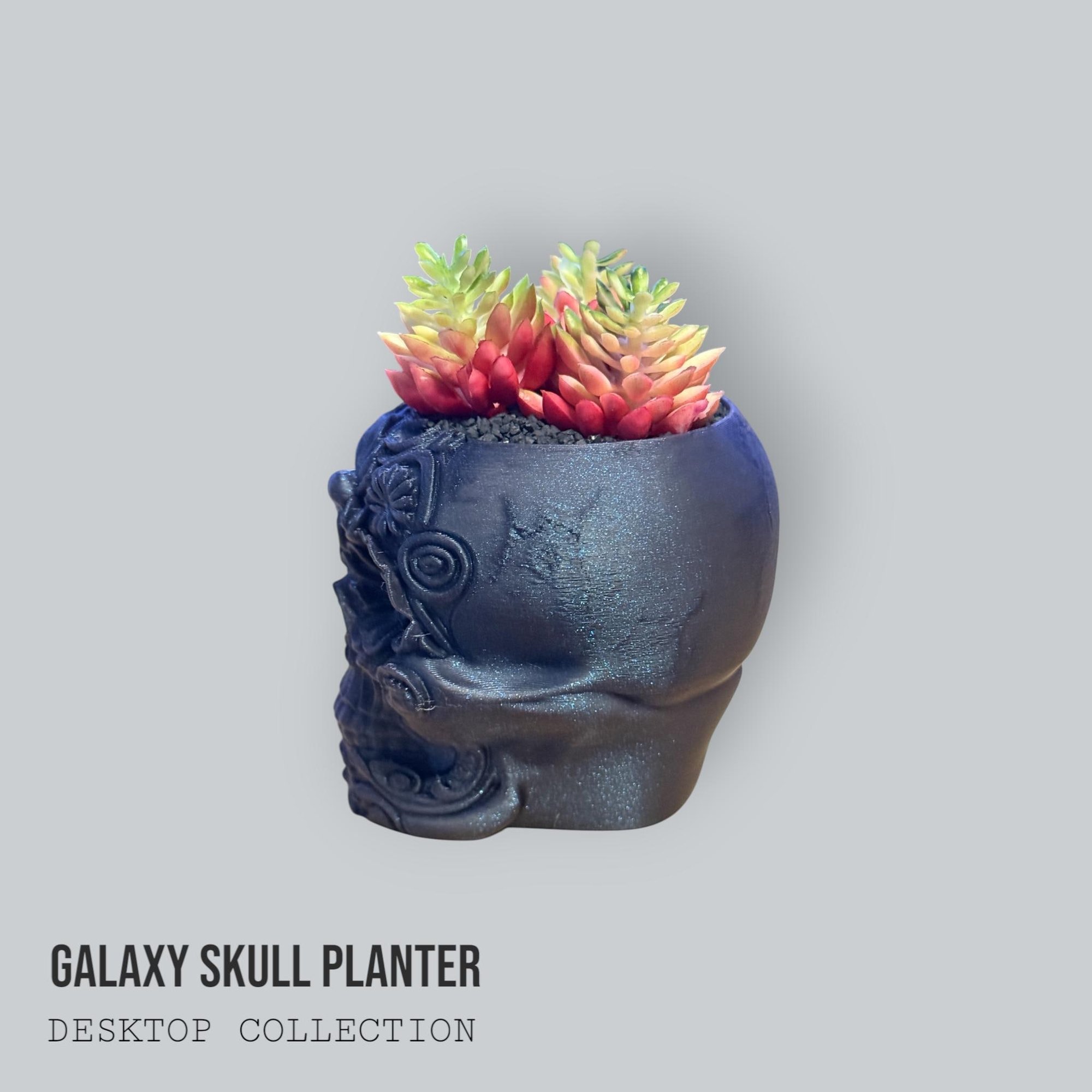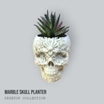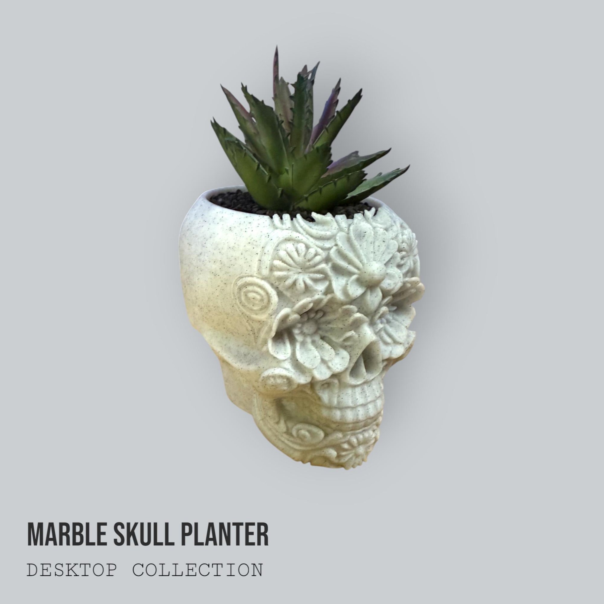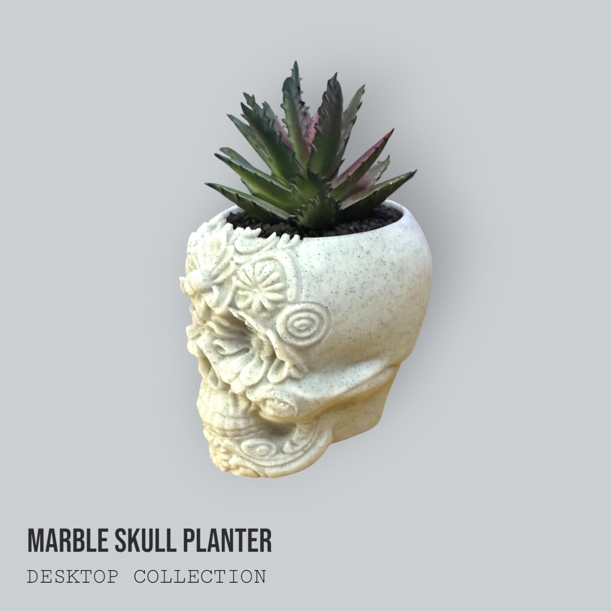 Add a splash of spooky chic to any shelf. This palm-sized 66 mm (≈ 2.6 inches) skull planter is 3D-printed in a swirled marble filament that resembles stone but weighs only a few ounces. Perfect for tiny succulents, air plants, or faux greenery—no drainage mess on your desk. Choose classic Marble White or cosmic Galaxy Black and swap plants in seconds thanks to the smooth interior. Hand-made in Oregon and shipped plastic-free within three business days.